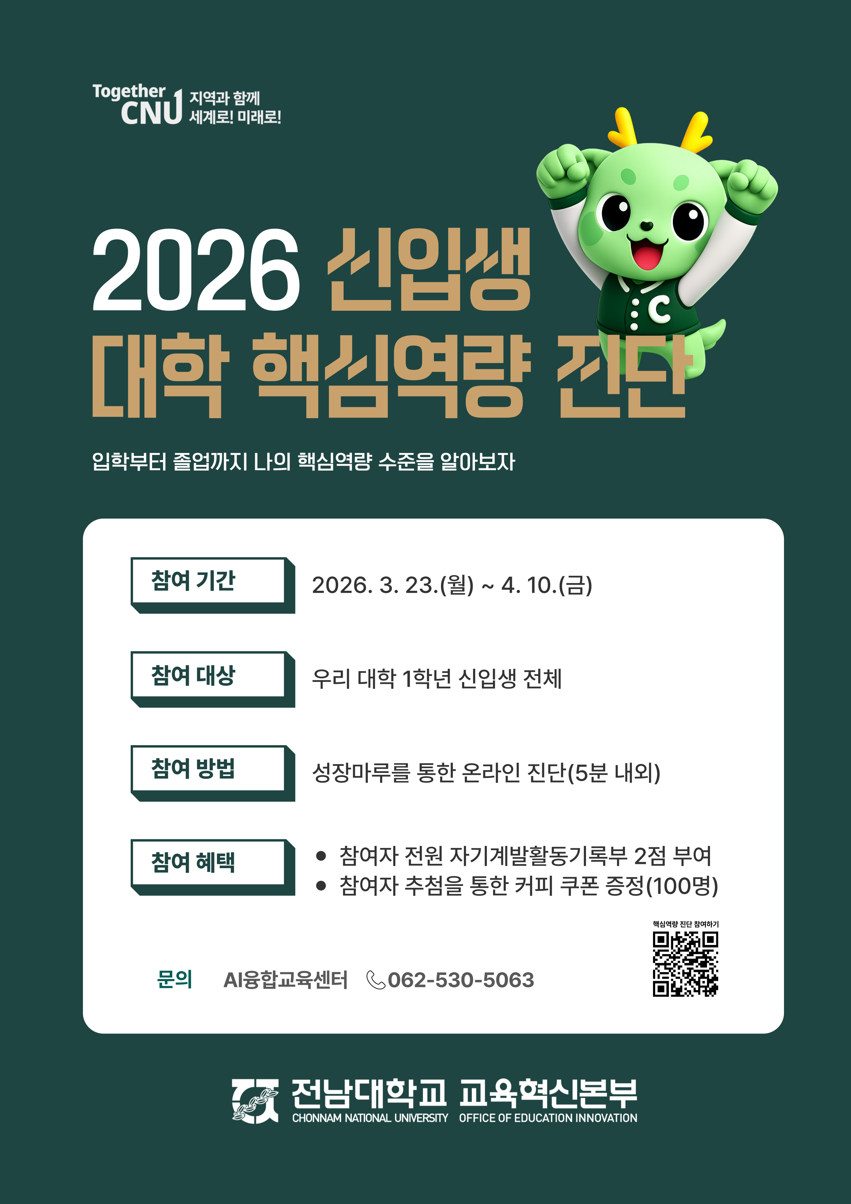 우리 대학 신입생을 대상으로 2026학년도 신입생 대학 핵심역량 진단을 실시 하오니, 많은 참여 바랍니다!