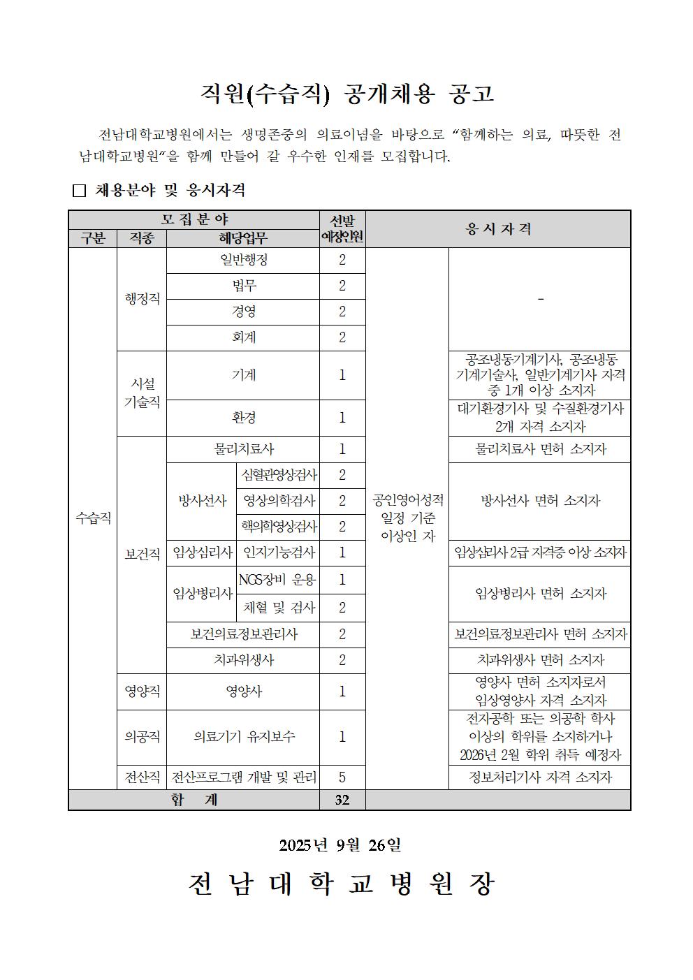 2025년 전남대학교병원 직원(수습직) 공개채용 공고